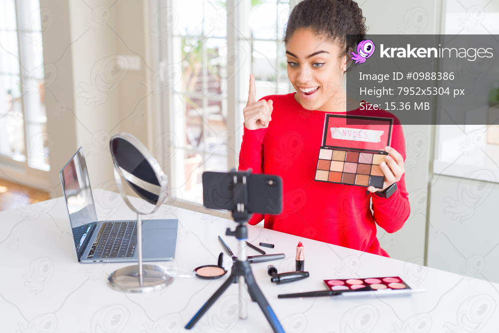 Young african american influencer woman recording make up tutorial surprised with an idea or question pointing finger with happy face, number one