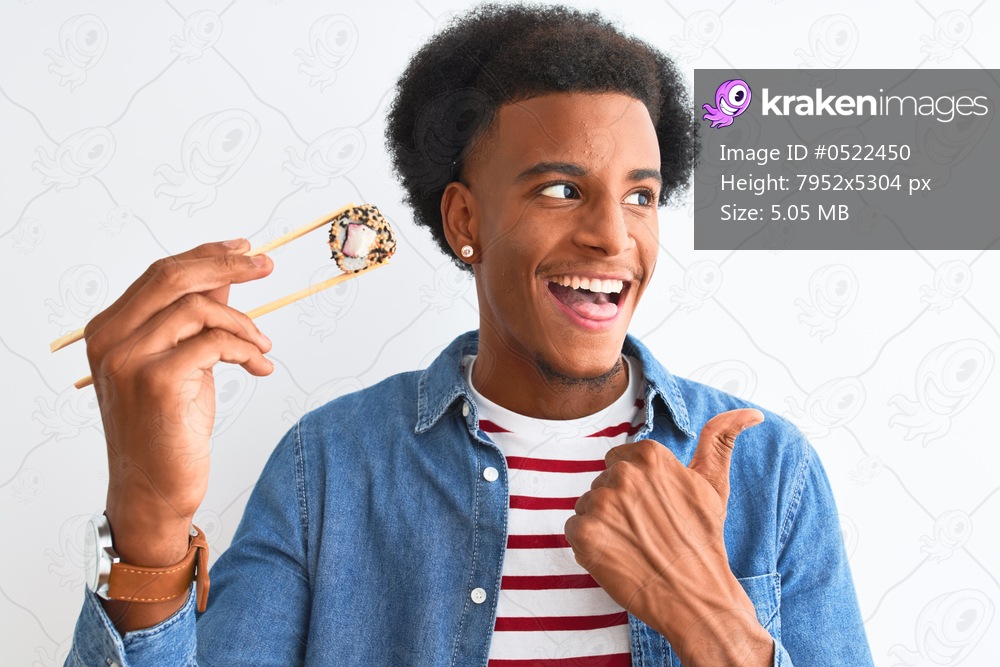 Young african american man eating sushi using chopsticks over isolated white background pointing and showing with thumb up to the side with happy face smiling - Kraken Images