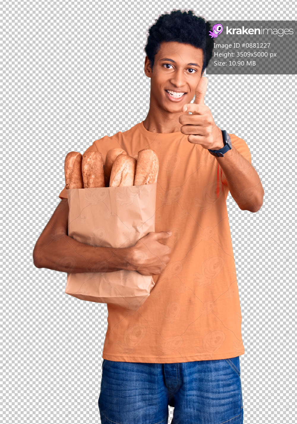 Young african american man holding paper bag with bread pointing fingers to camera with happy and funny face. good energy and vibes.