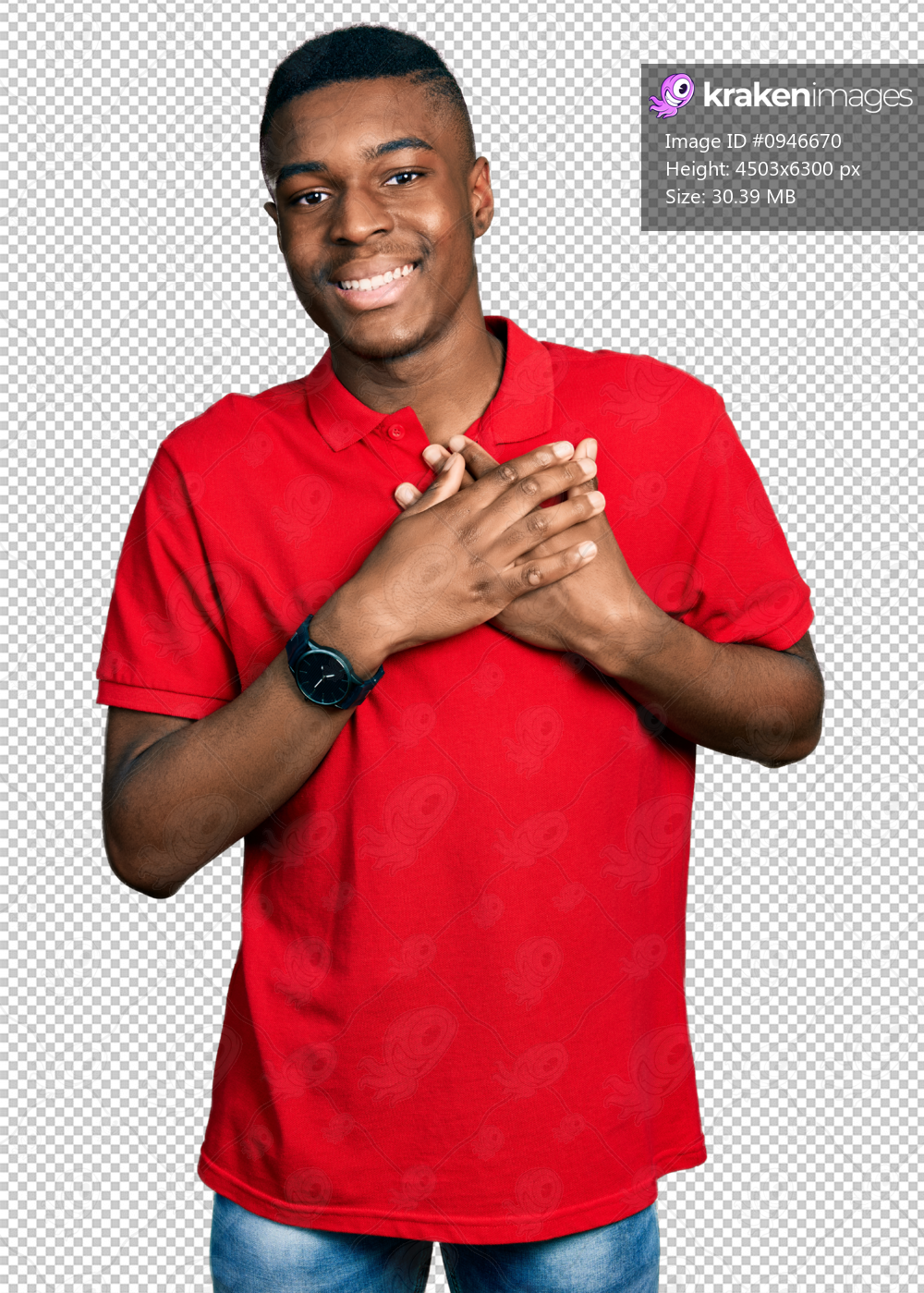 Young african american man wearing casual red t shirt smiling with hands on chest with closed eyes and grateful gesture on face. health concept.