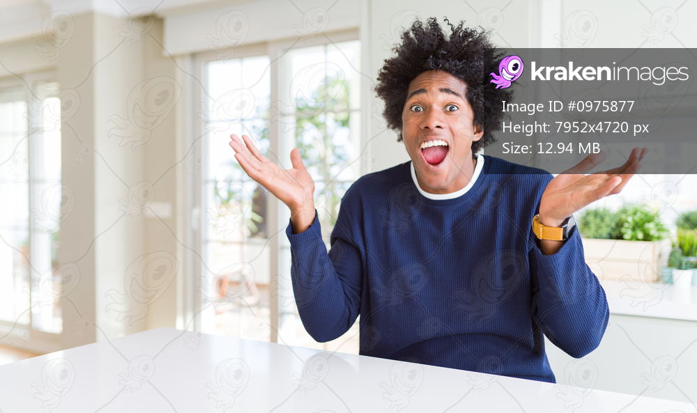Young african american man wearing casual sweater sitting at home celebrating crazy and amazed for success with arms raised and open eyes screaming excited. Winner concept - Kraken Images