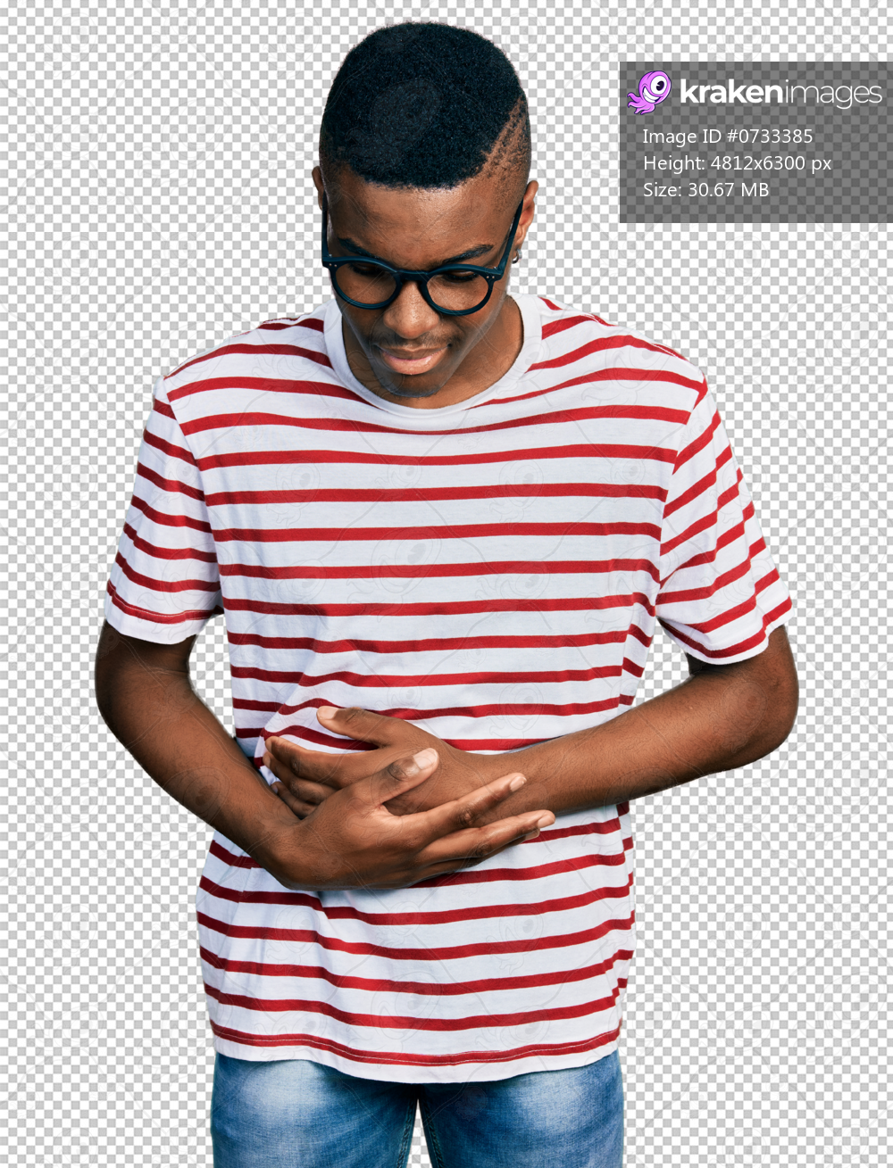 Young african american man wearing casual t shirt and glasses with hand on stomach because indigestion, painful illness feeling unwell. ache concept.