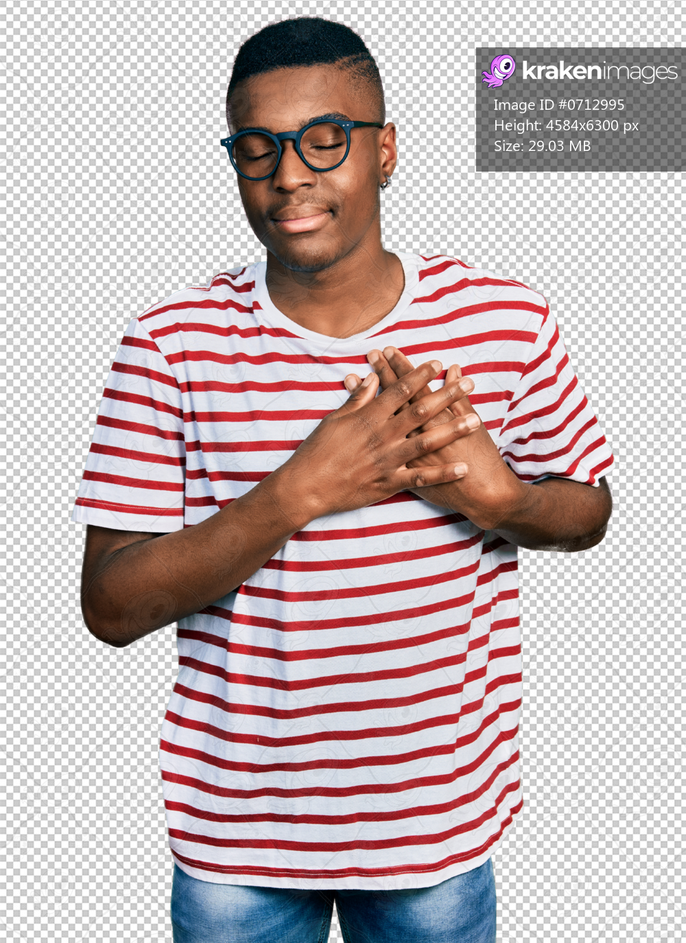 Young african american man wearing casual t shirt and glasses smiling with hands on chest with closed eyes and grateful gesture on face. health concept. - Kraken Images