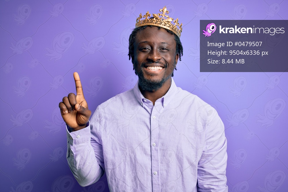 Young african american man wearing golden crown of king over isolated purple background showing and pointing up with finger number one while smiling confident and happy. - Kraken Images