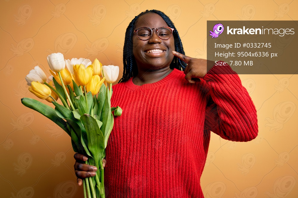 Young african american plus size woman with braids holding bouquet of yellow tulips flower smiling cheerful showing and pointing with fingers teeth and mouth. Dental health concept. - Kraken Images