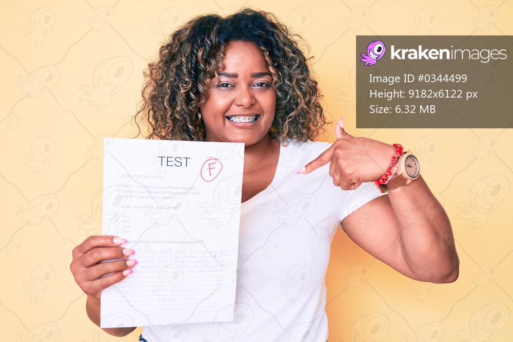 Young african american plus size woman showing a failed exam pointing finger to one self smiling happy and proud