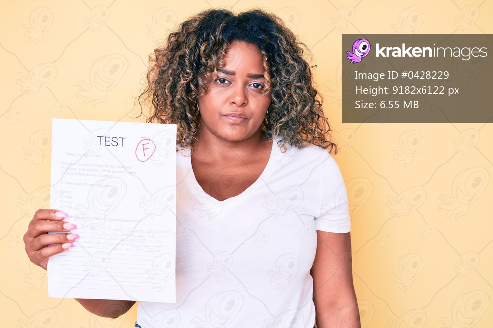 Young african american plus size woman showing a failed exam thinking attitude and sober expression looking self confident