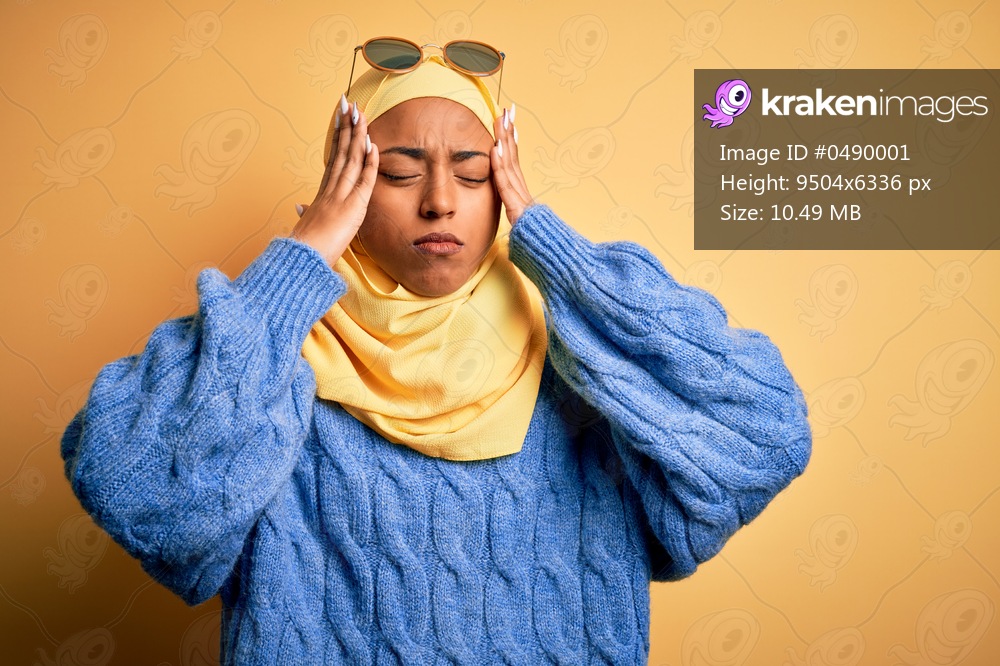 Young African American student woman wearing yellow muslim hijab and sunglasses suffering from headache desperate and stressed because pain and migraine. Hands on head. - Kraken Images