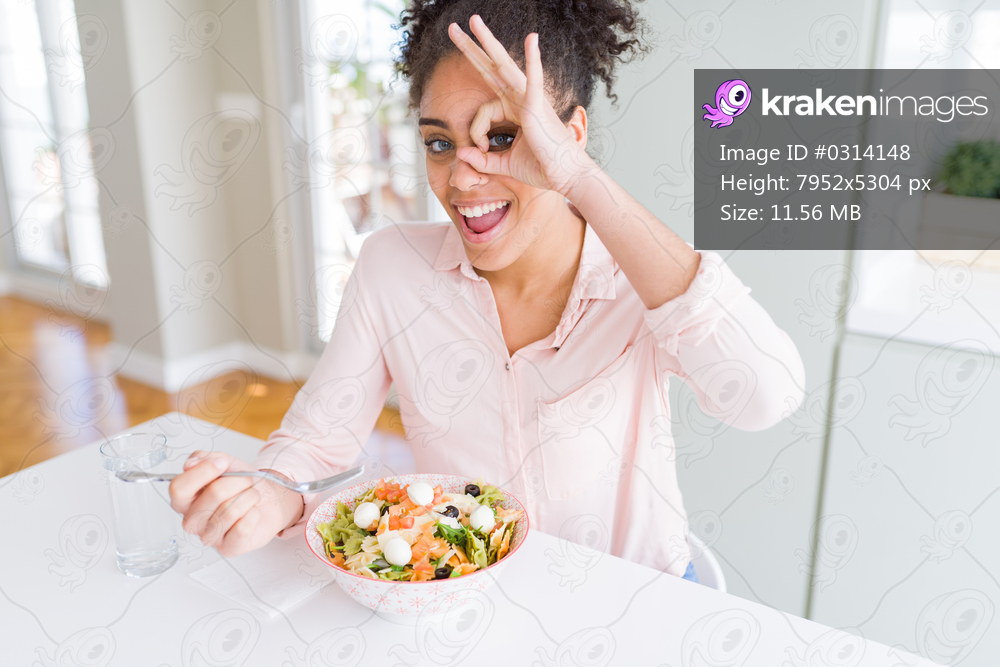 Young african american woman eating healthy pasta salad with happy face smiling doing ok sign with hand on eye looking through fingers