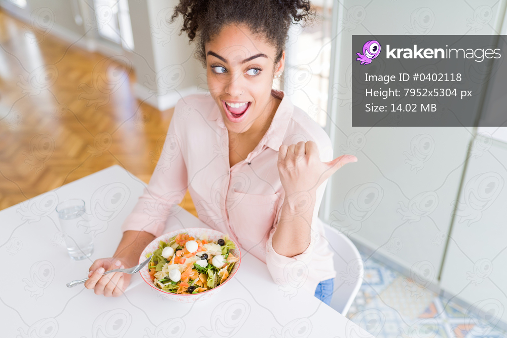 Young african american woman eating healthy pasta salad pointing and showing with thumb up to the side with happy face smiling