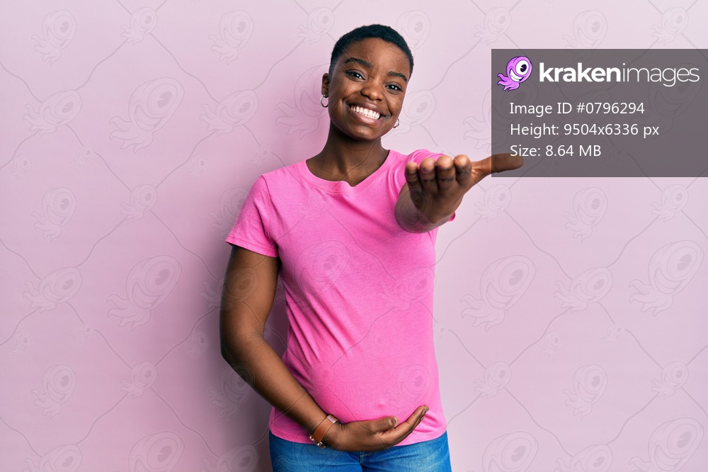 Young african american woman expecting a baby, touching pregnant belly smiling friendly offering handshake as greeting and welcoming. successful business. - Kraken Images