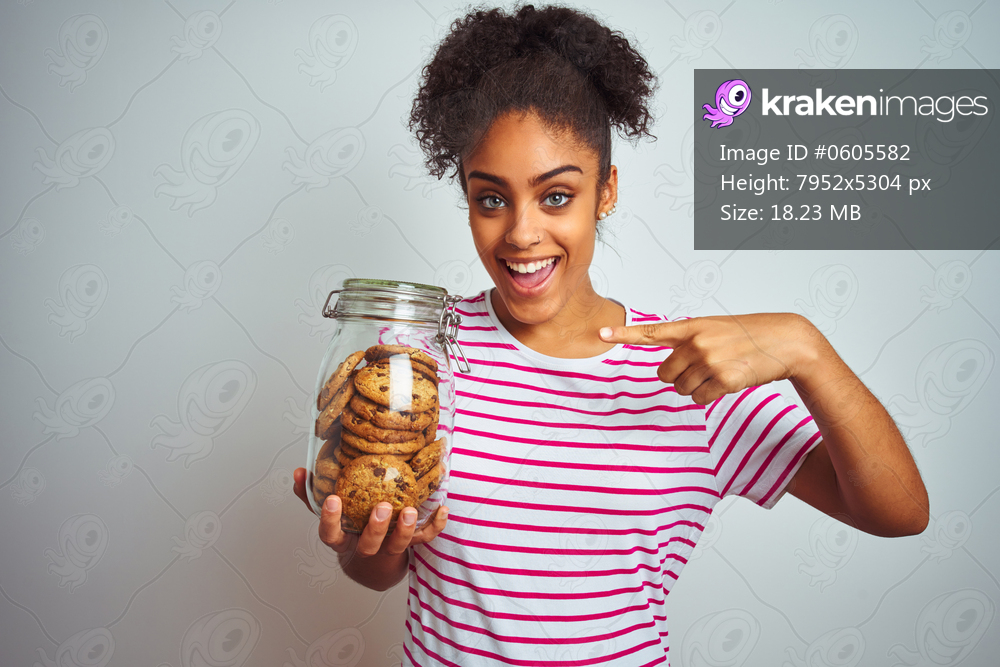 Young african american woman holding a jar of cookies over isolated white background very happy pointing with hand and finger