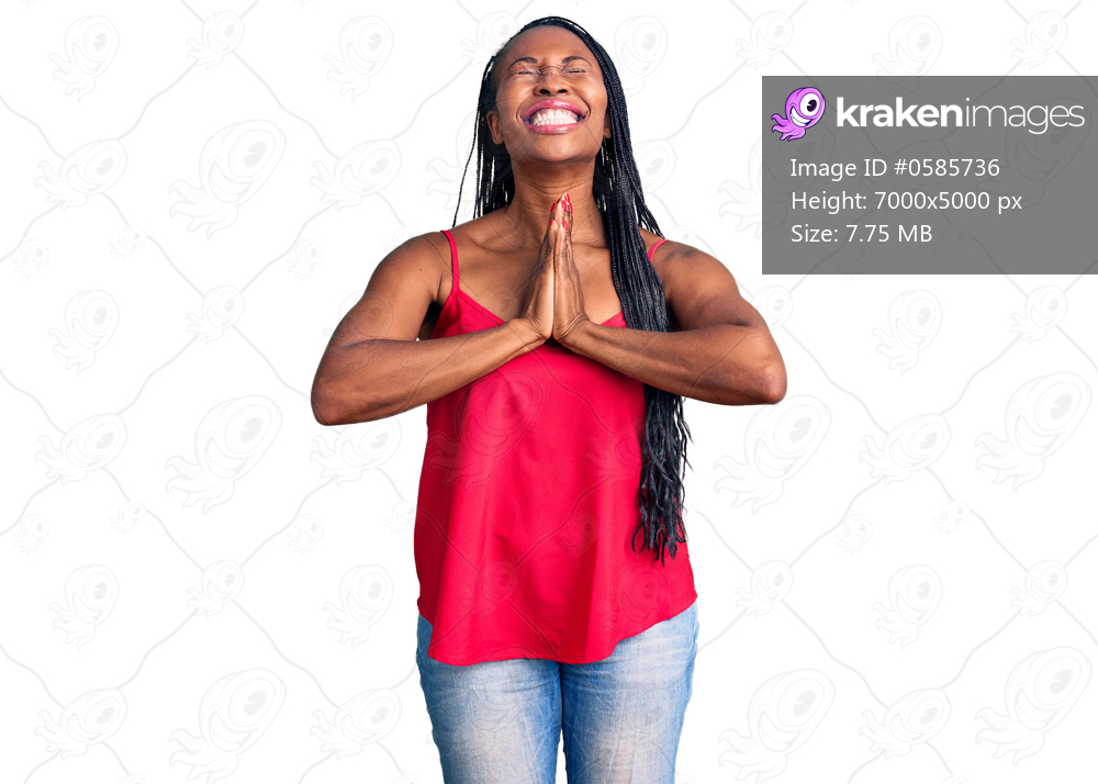 Young african american woman wearing casual clothes praying with hands together asking for forgiveness smiling confident.