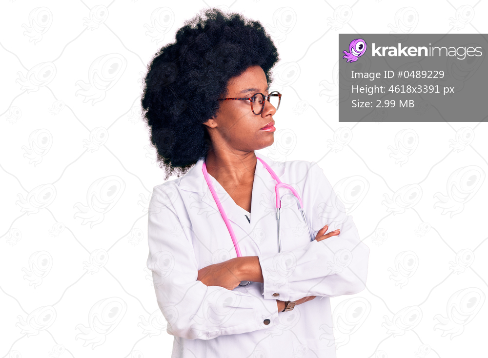Young african american woman wearing doctor coat and stethoscope looking to the side with arms crossed convinced and confident