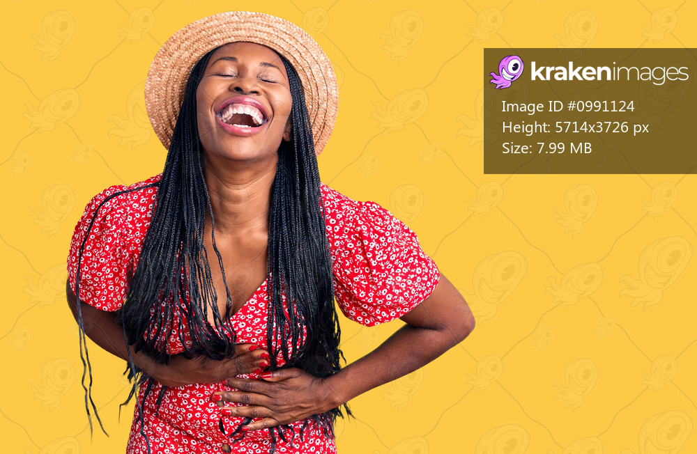 Young african american woman wearing summer hat smiling and laughing hard out loud because funny crazy joke with hands on body.
