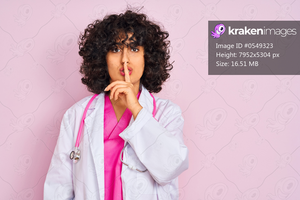 Young arab doctor woman with curly hair wearing stethoscope over isolated pink background asking to be quiet with finger on lips. Silence and secret concept. - Kraken Images