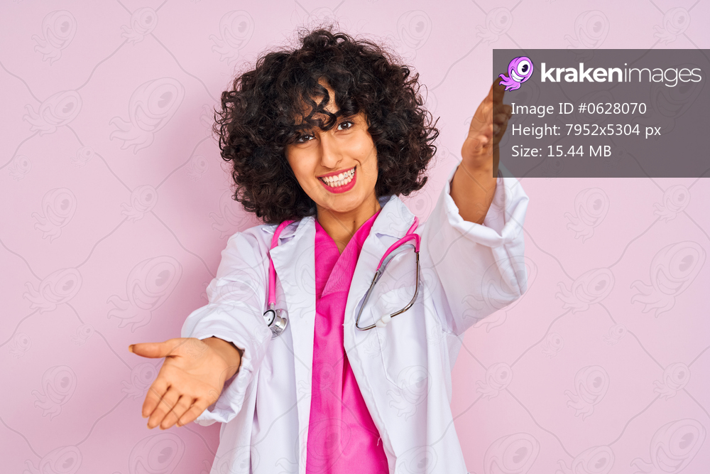 Young arab doctor woman with curly hair wearing stethoscope over isolated pink background looking at the camera smiling with open arms for hug. Cheerful expression embracing happiness. - Kraken Images