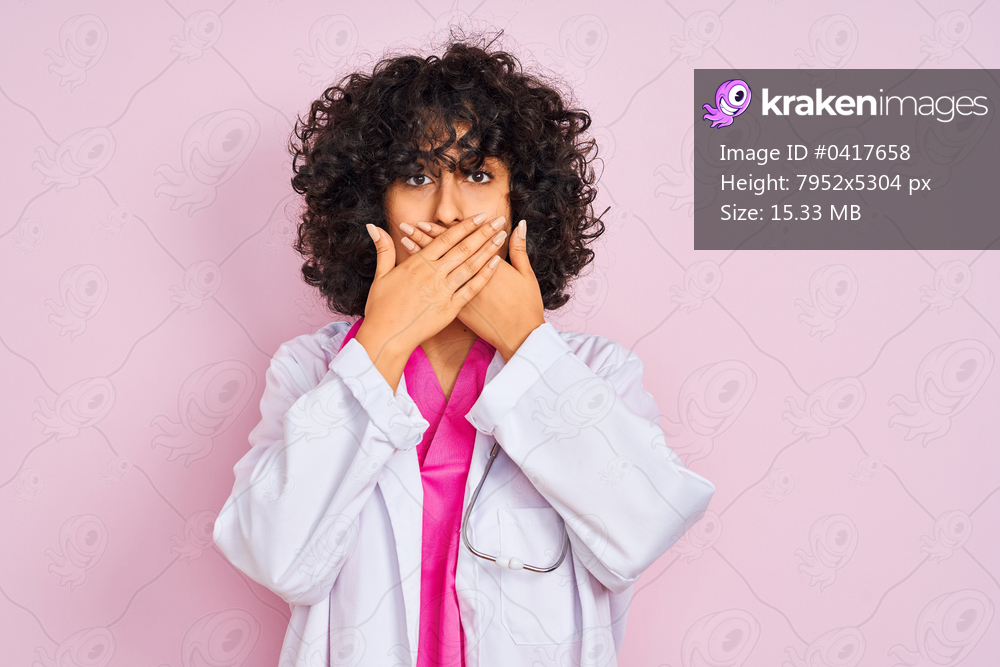 Young arab doctor woman with curly hair wearing stethoscope over isolated pink background shocked covering mouth with hands for mistake. Secret concept. - Kraken Images