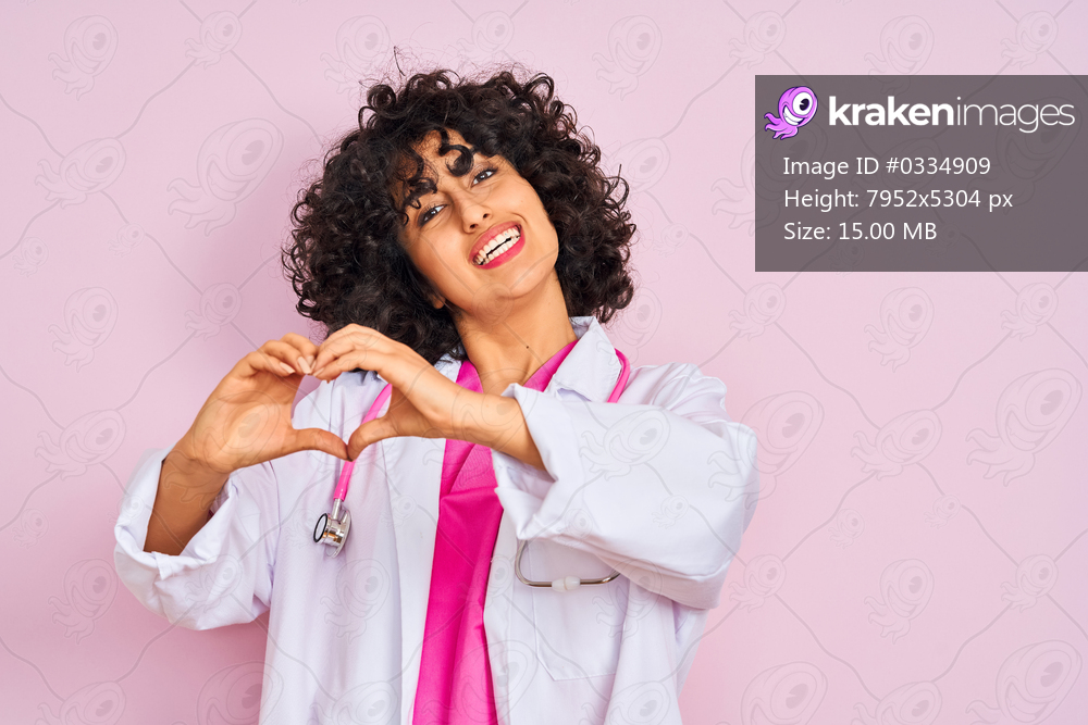 Young arab doctor woman with curly hair wearing stethoscope over isolated pink background smiling in love doing heart symbol shape with hands. Romantic concept. - Kraken Images