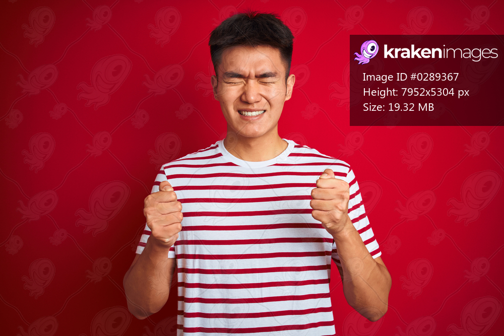 Young asian chinese man wearing striped t-shirt standing over isolated red background excited for success with arms raised and eyes closed celebrating victory smiling. Winner concept. - Kraken Images
