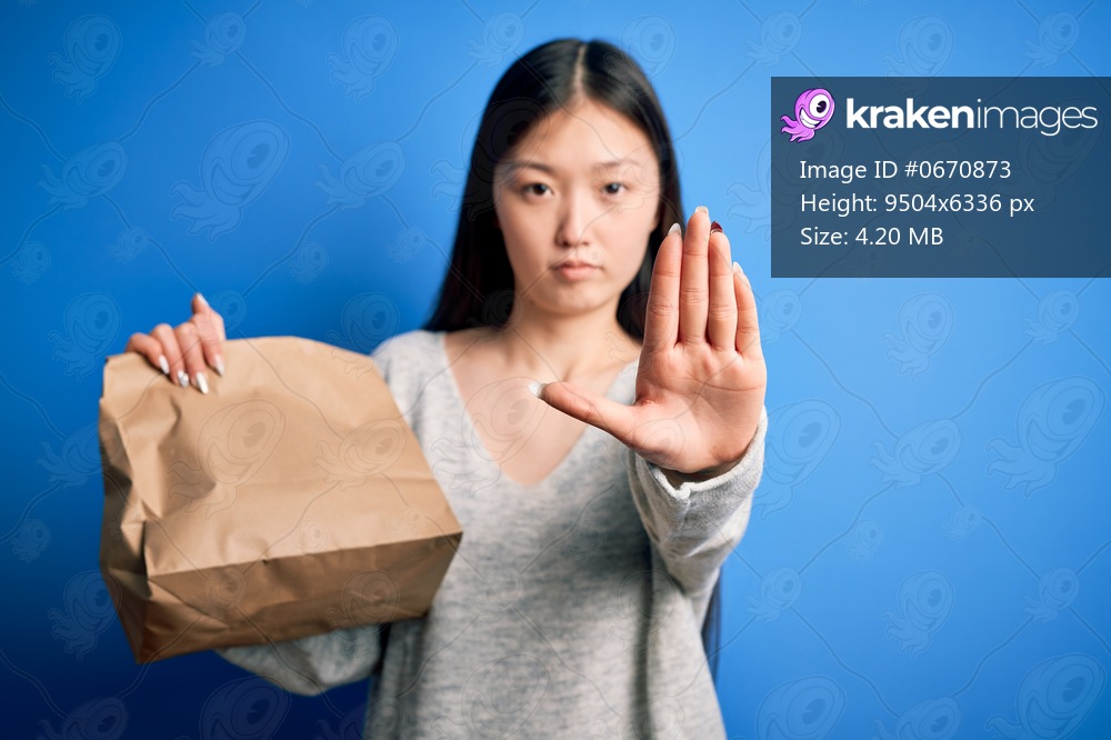 Young asian woman holding delivery paper bag for takeaway food over blue isolated background with open hand doing stop sign with serious and confident expression, defense gesture - Kraken Images
