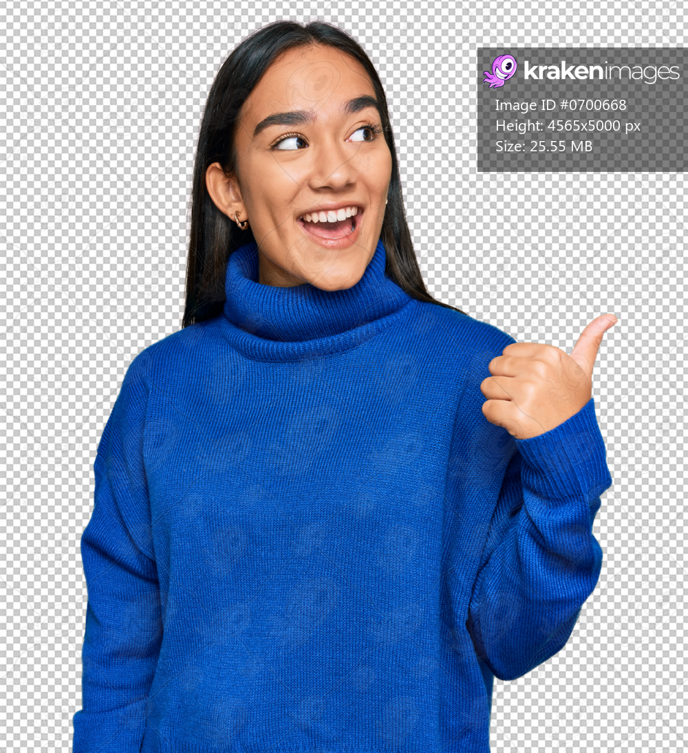 Young asian woman wearing casual winter sweater smiling with happy face looking and pointing to the side with thumb up.