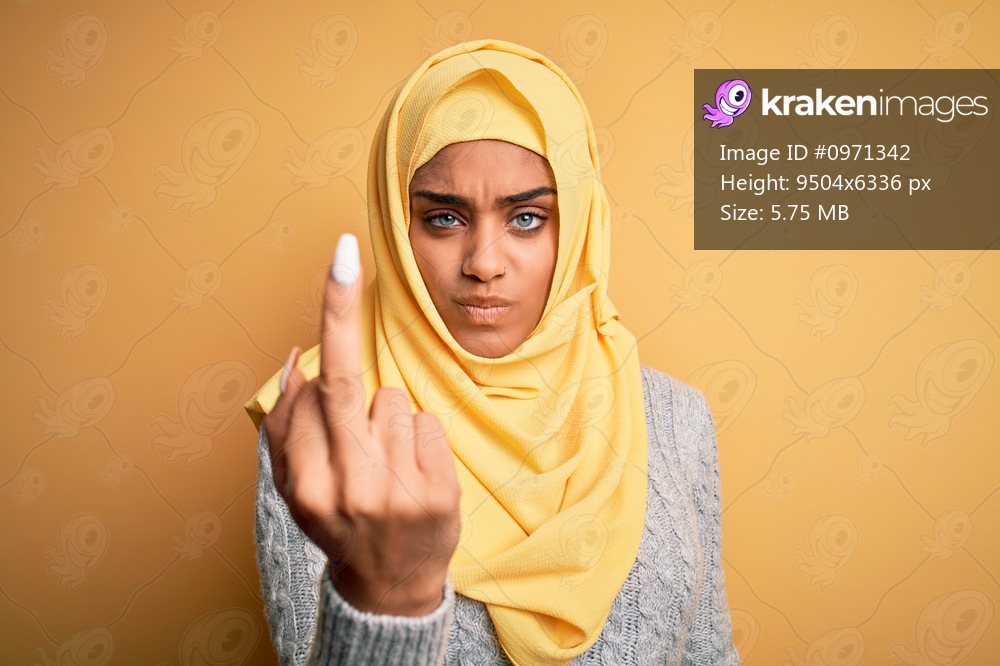 Young beautiful african american girl wearing muslim hijab over isolated yellow background Showing middle finger, impolite and rude fuck off expression - Kraken Images