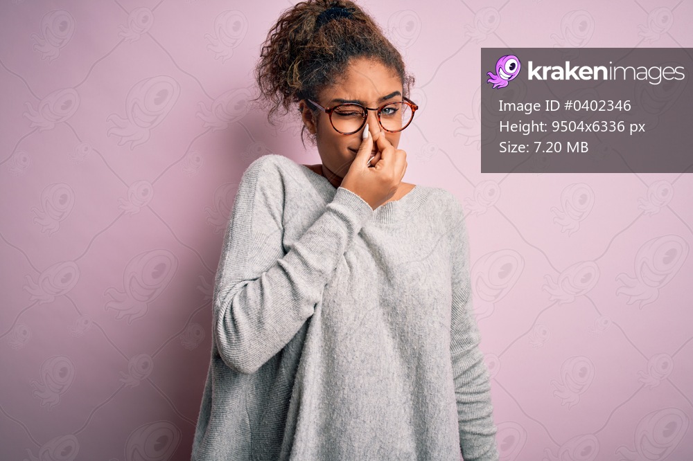 Young beautiful african american girl wearing sweater and glasses over pink background smelling something stinky and disgusting, intolerable smell, holding breath with fingers on nose. Bad smell - Kraken Images