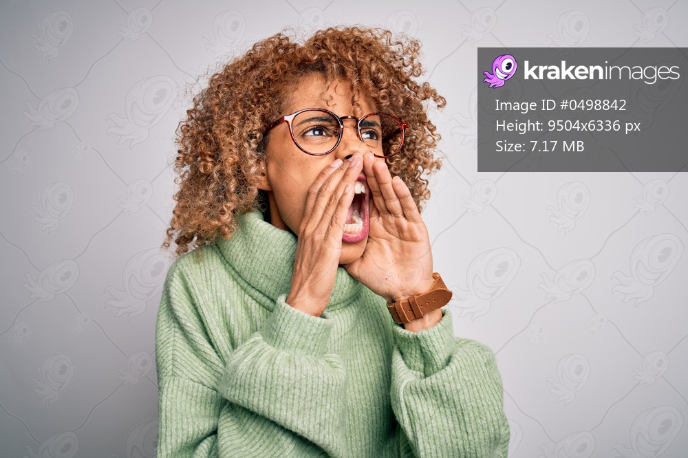 Young beautiful african american woman wearing turtleneck sweater and glasses Shouting angry out loud with hands over mouth