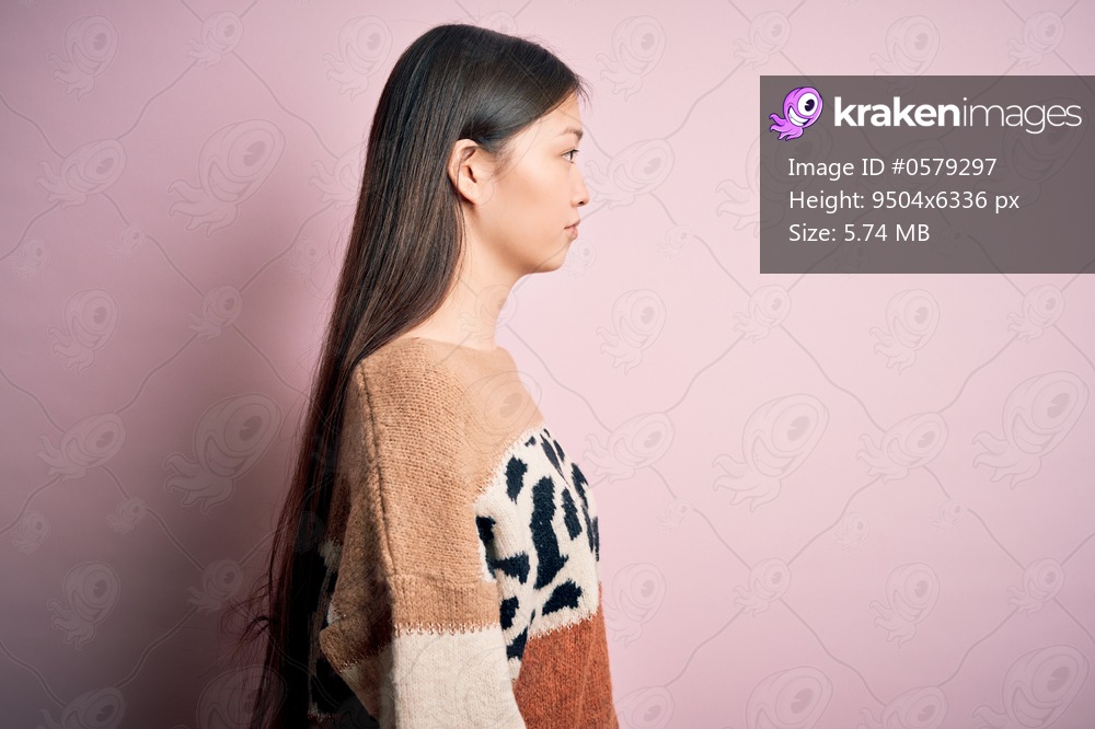 Young beautiful asian woman wearing animal print fashion sweater over pink isolated background looking to side, relax profile pose with natural face with confident smile. - Kraken Images
