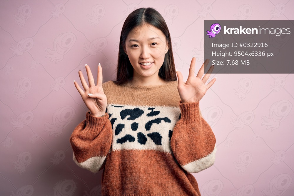 Young beautiful asian woman wearing animal print fashion sweater over pink isolated background showing and pointing up with fingers number nine while smiling confident and happy. - Kraken Images