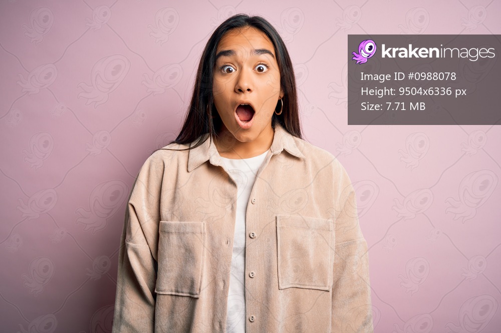 Young beautiful asian woman wearing casual shirt standing over pink background afraid and shocked with surprise and amazed expression, fear and excited face. - Kraken Images