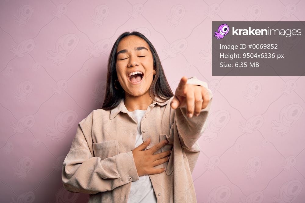 Young beautiful asian woman wearing casual shirt standing over pink background laughing at you, pointing finger to the camera with hand over body, shame expression - Kraken Images