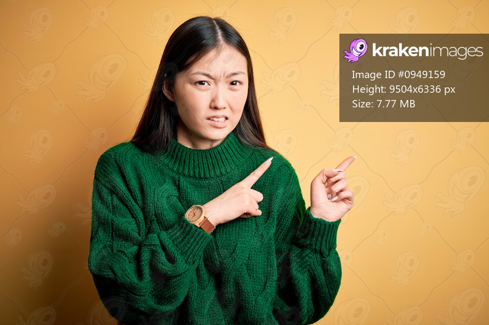 Young beautiful asian woman wearing green winter sweater over yellow isolated background Pointing aside worried and nervous with both hands, concerned and surprised expression - Kraken Images