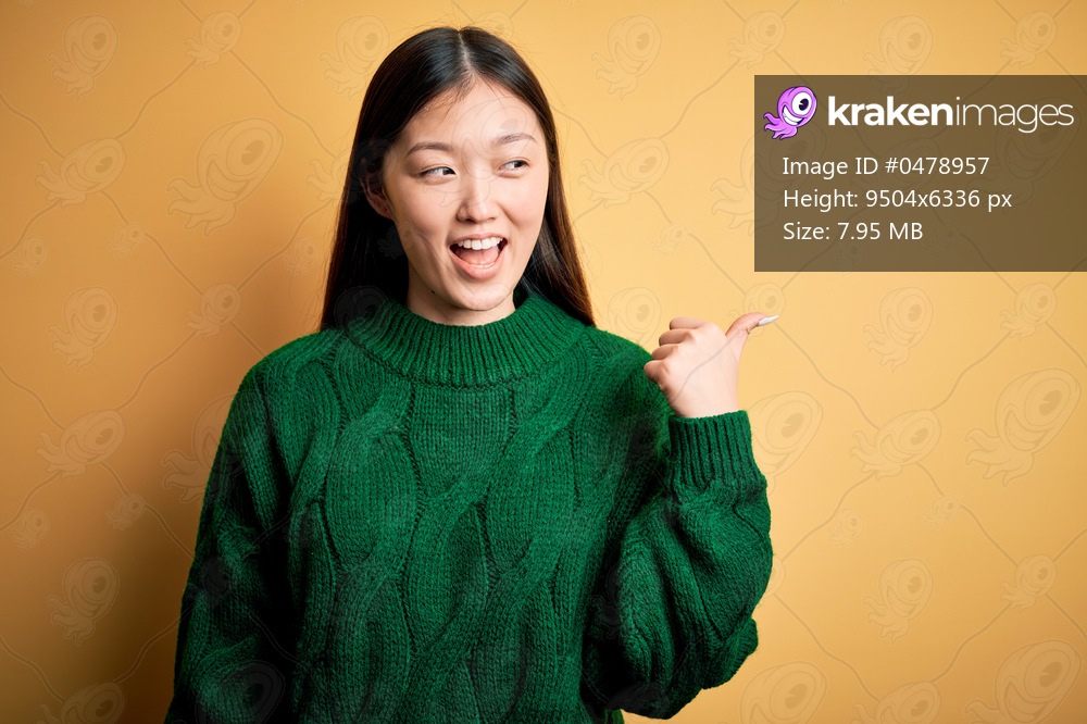 Young beautiful asian woman wearing green winter sweater over yellow isolated background smiling with happy face looking and pointing to the side with thumb up. - Kraken Images