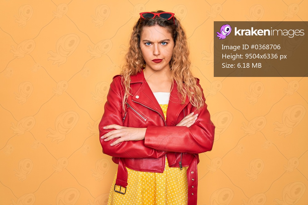 Young beautiful blonde woman pin-up with blue eyes wearing red sunglasses and jacket skeptic and nervous, disapproving expression on face with crossed arms. Negative person. - Kraken Images