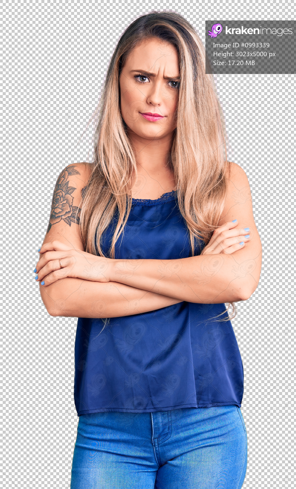 Young beautiful blonde woman wearing casual sleeveless t-shirt skeptic and nervous, disapproving expression on face with crossed arms. negative person. - Kraken Images