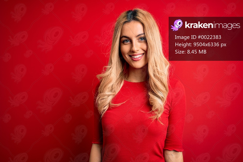 Young beautiful blonde woman wearing casual t-shirt standing over isolated red background with a happy and cool smile on face. Lucky person.