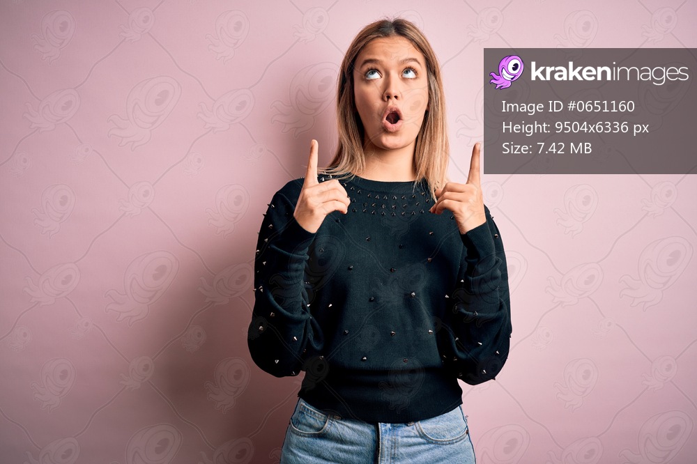 Young beautiful blonde woman wearing fashion sweater over pink isolated background amazed and surprised looking up and pointing with fingers and raised arms. - Kraken Images