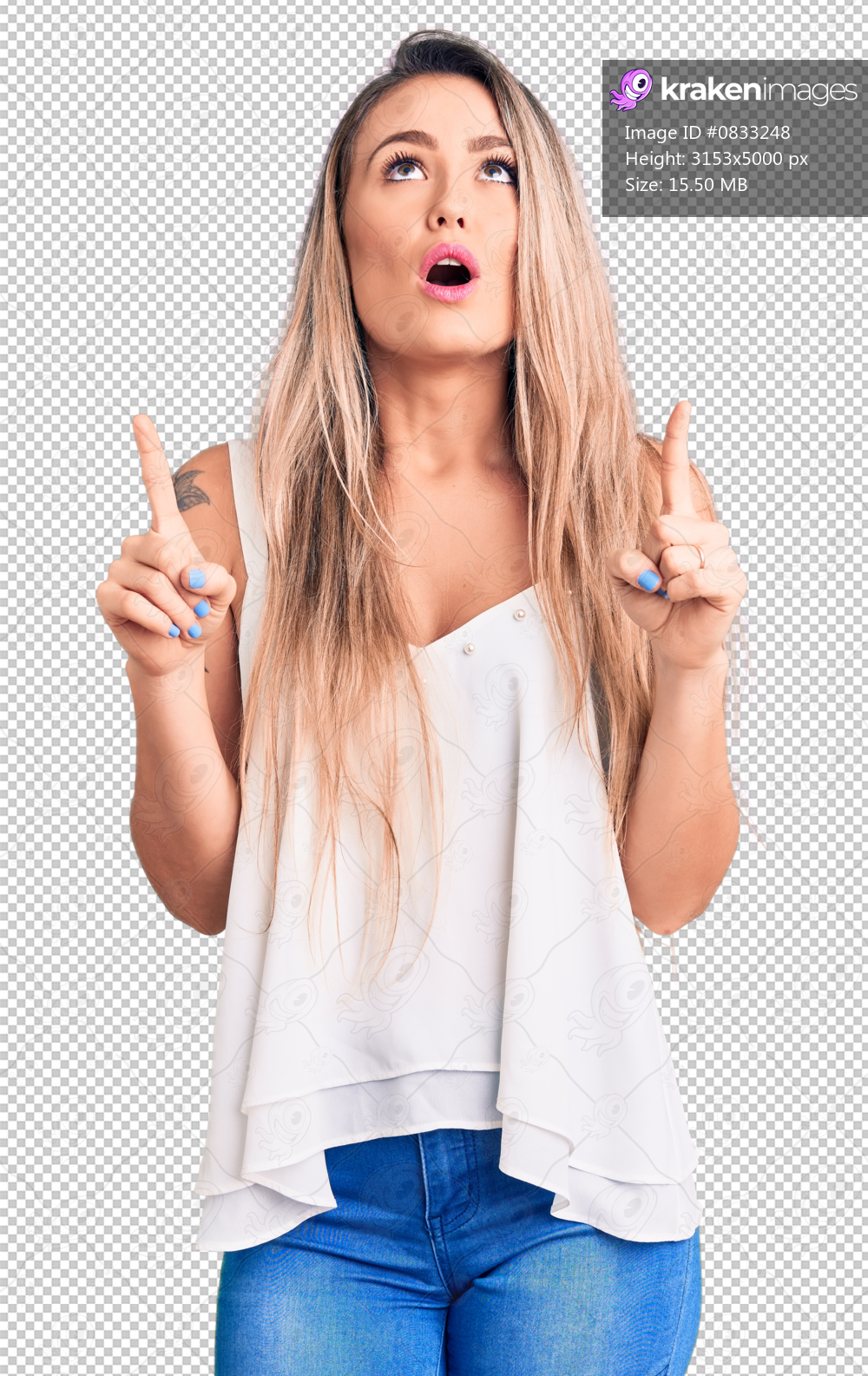 Young beautiful blonde woman wearing sleeveless t-shirt amazed and surprised looking up and pointing with fingers and raised arms.