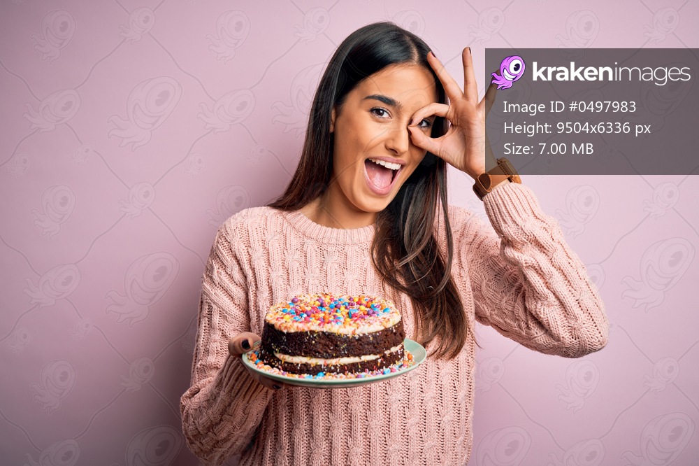 Young beautiful brunette woman holding birthday delicious cake over pink background with happy face smiling doing ok sign with hand on eye looking through fingers - Kraken Images