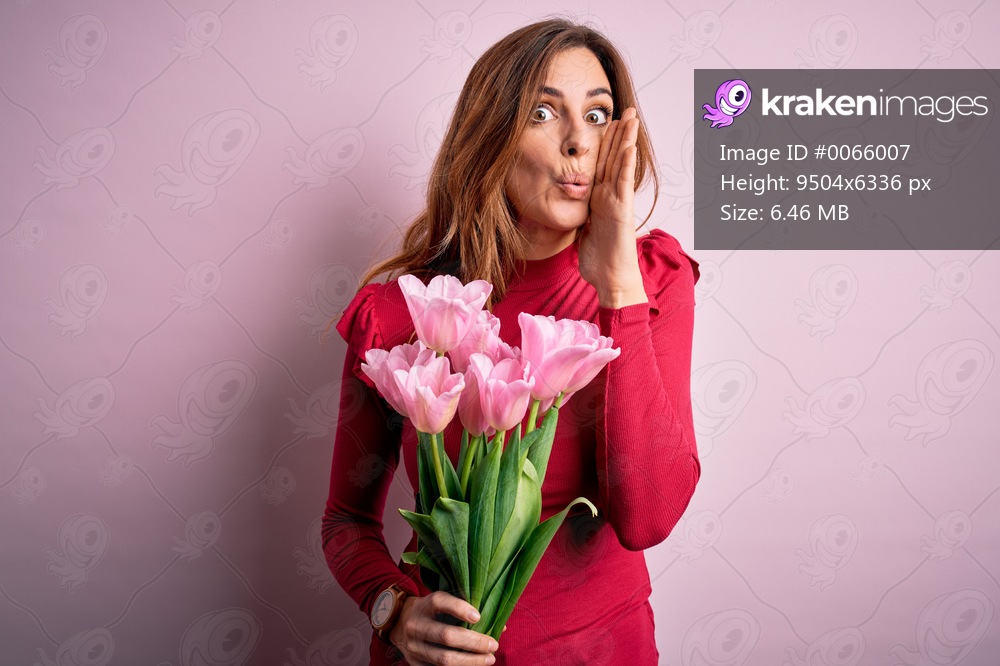 Young beautiful brunette woman holding bouquet of pink tulips over isolated background hand on mouth telling secret rumor, whispering malicious talk conversation - Kraken Images