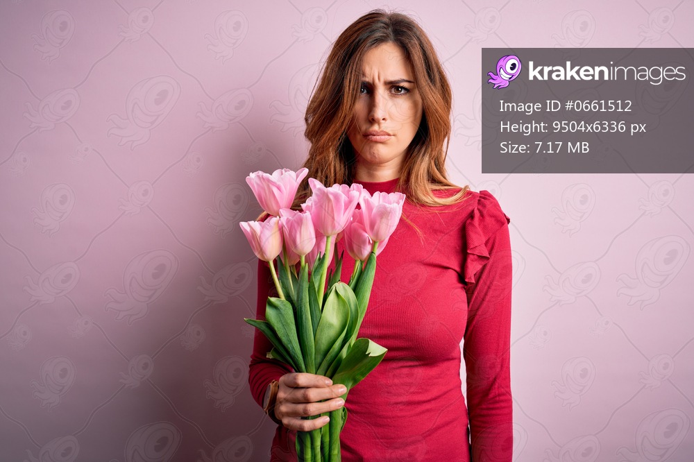 Young beautiful brunette woman holding bouquet of pink tulips over isolated background skeptic and nervous, frowning upset because of problem. Negative person. - Kraken Images