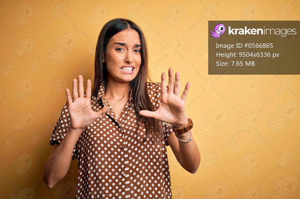 Young beautiful brunette woman wearing casual shirt over isolated yellow background afraid and terrified with fear expression stop gesture with hands, shouting in shock. Panic concept. - Kraken Images