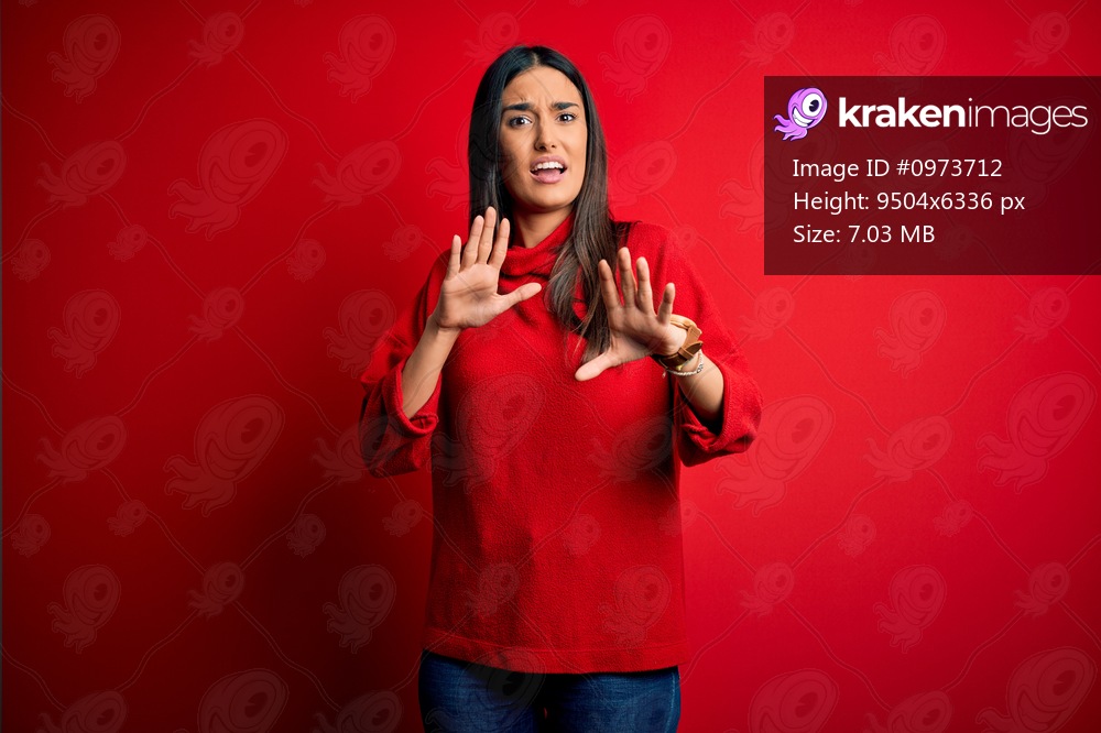 Young beautiful brunette woman wearing casual sweater over isolated red background afraid and terrified with fear expression stop gesture with hands, shouting in shock. Panic concept. - Kraken Images