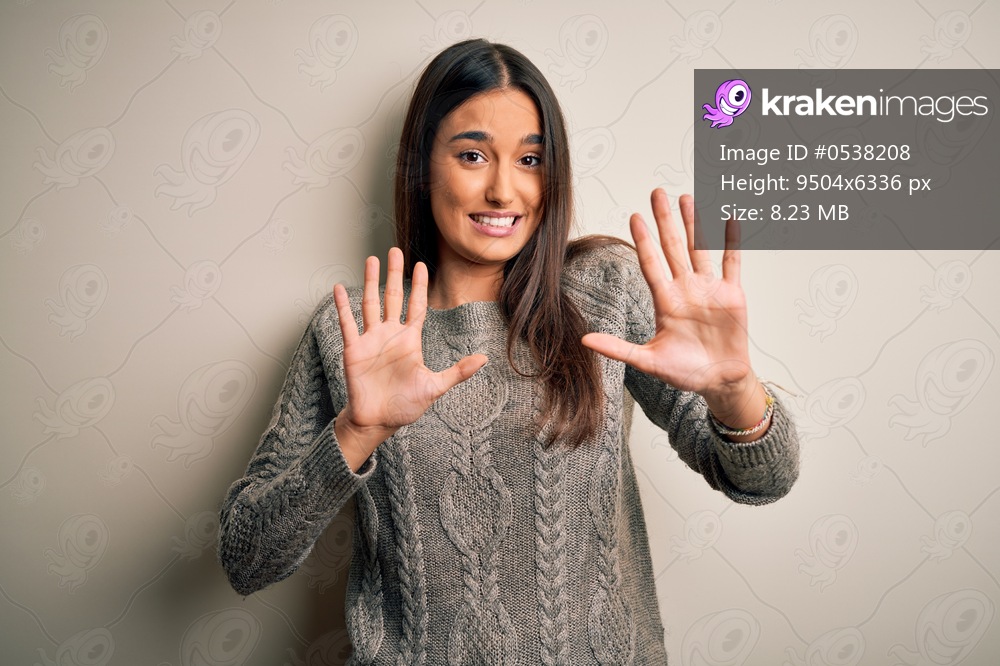 Young beautiful brunette woman wearing casual sweater over isolated white background afraid and terrified with fear expression stop gesture with hands, shouting in shock. Panic concept. - Kraken Images
