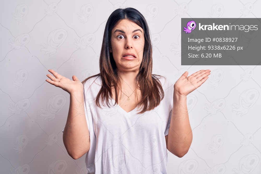 Young beautiful brunette woman wearing casual t-shirt standing over isolated white background clueless and confused with open arms, no idea and doubtful face. - Kraken Images