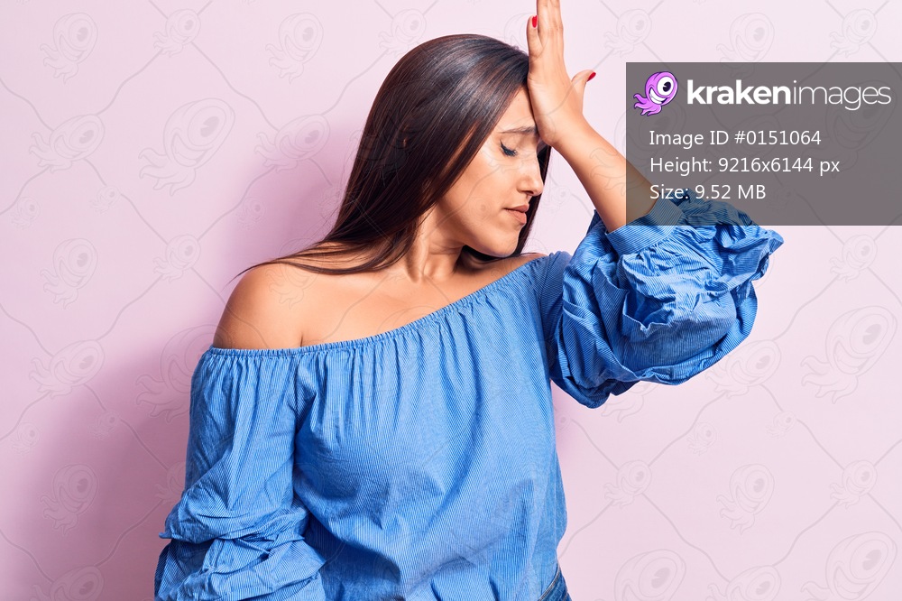 Young beautiful brunette woman wearing casual t-shirt surprised with hand on head for mistake, remember error. forgot, bad memory concept.