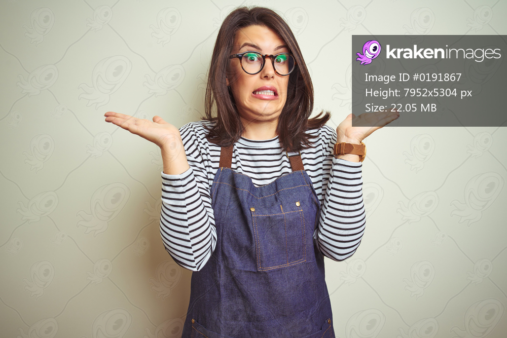 Young beautiful business woman wearing store uniform apron over isolated background clueless and confused expression with arms and hands raised. Doubt concept. - Kraken Images
