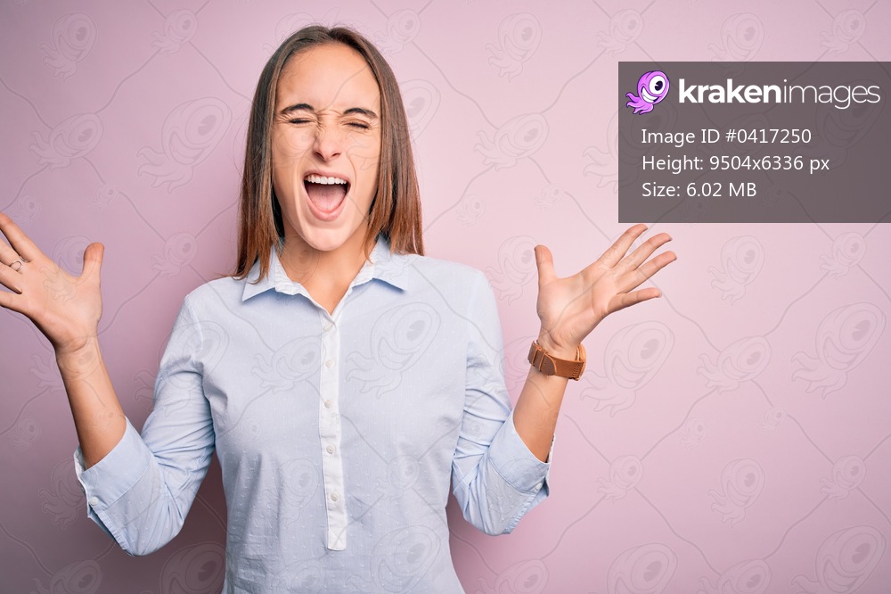 Young beautiful businesswoman wearing elegant shirt standing over isolated pink background celebrating mad and crazy for success with arms raised and closed eyes screaming excited. Winner concept - Kraken Images